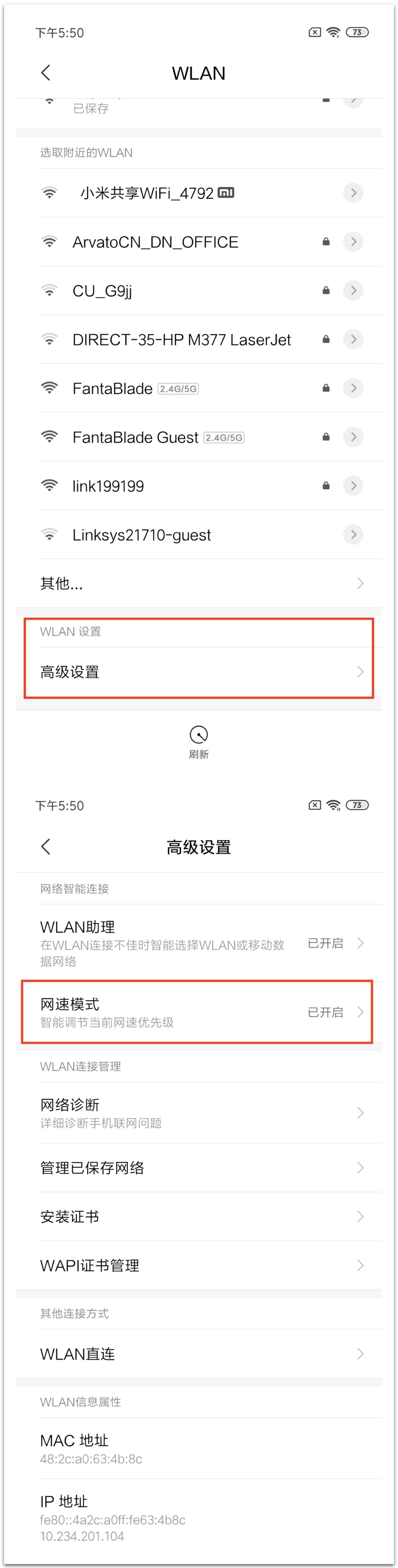 设置---->WLAN---->WLAN设置---->高级设置---->网速模式---->普通模式