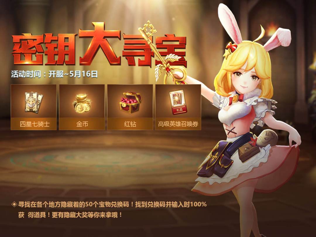 重点福利推荐给各位骑士们啦!这次的密匙大寻宝活动时间从开服会一直持续到5月16日,活动期间,玩家通过收集(50个)宝藏密钥,在游戏内的活动页面就可以兑换奖励哦。这次活动的奖励非常丰厚,骑士大大赶紧准备参加呀!