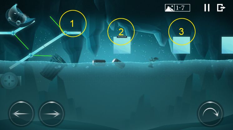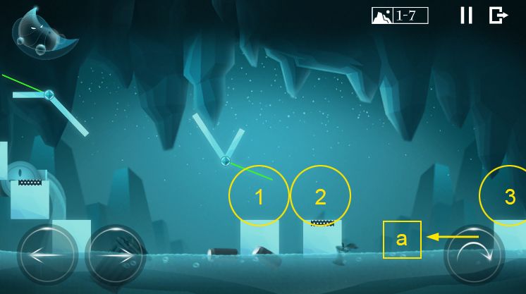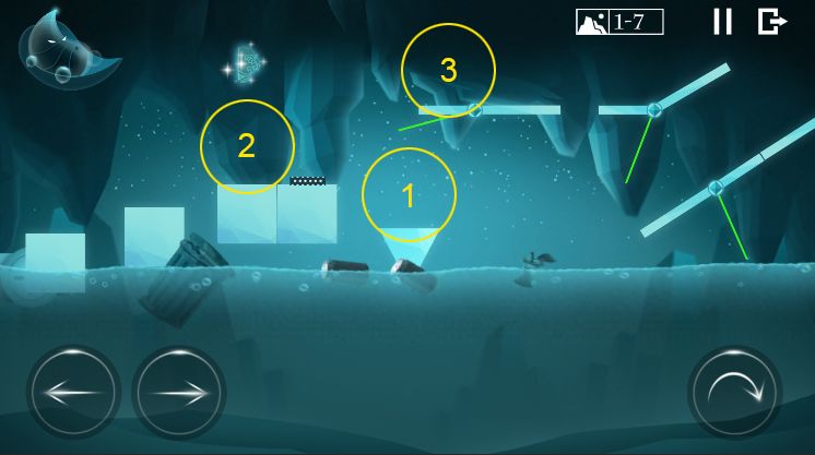 又一个考验心理承受能力的地方来了。玩家来到上图位置1的时候,应该有、也必须有大气泡,当位置2的方块像左移动到如图的位置,海绵会升起来,当海绵退缩的时候,玩家马上跳到位置2的方块上,这个时候,1和2的距离相对会比较远,而且2是往右侧移动的,所以要求水珠人是在大气泡包围的状态完成这一步,然后跳跃到位置3。透露一下,位置2的海绵退下去后,不会很快的升上来,它有5秒的隐藏时间,水珠人可以大胆地站在上面。