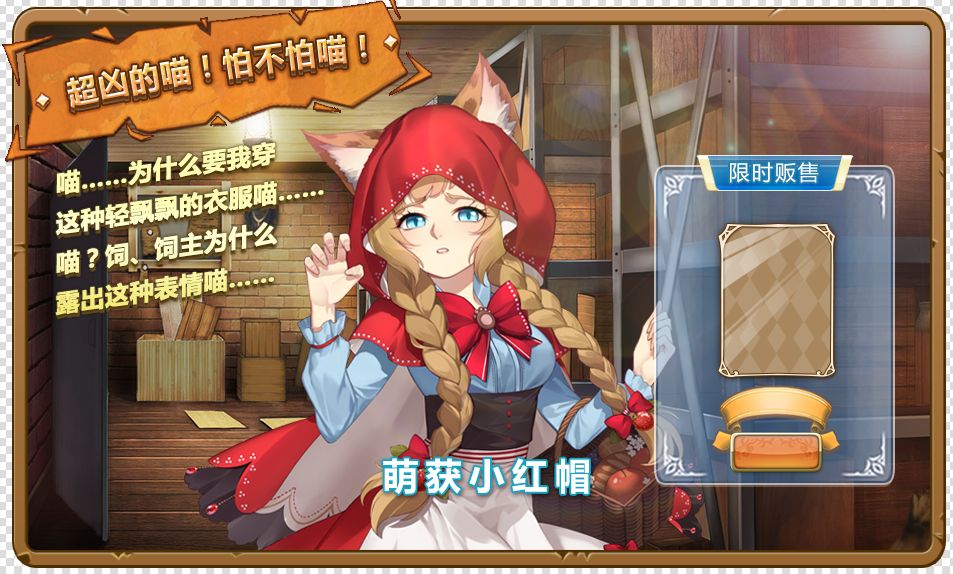 本次更新后将会限时出售萌获的限定时装小红帽,赠送小红帽时装后还能触发专属时装剧情,并能够获得专属CG哟!