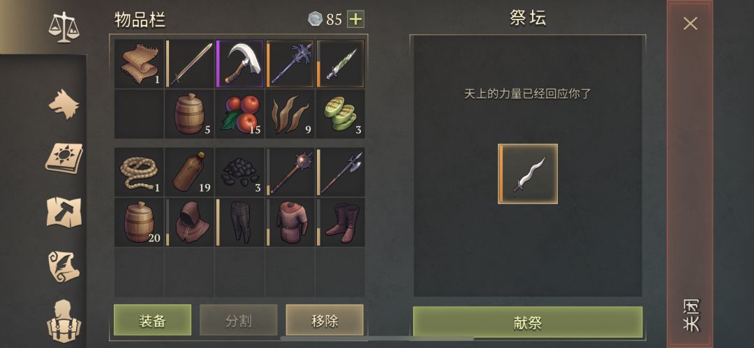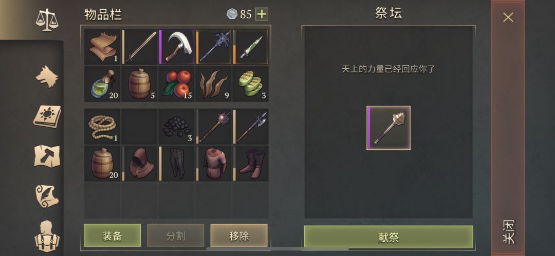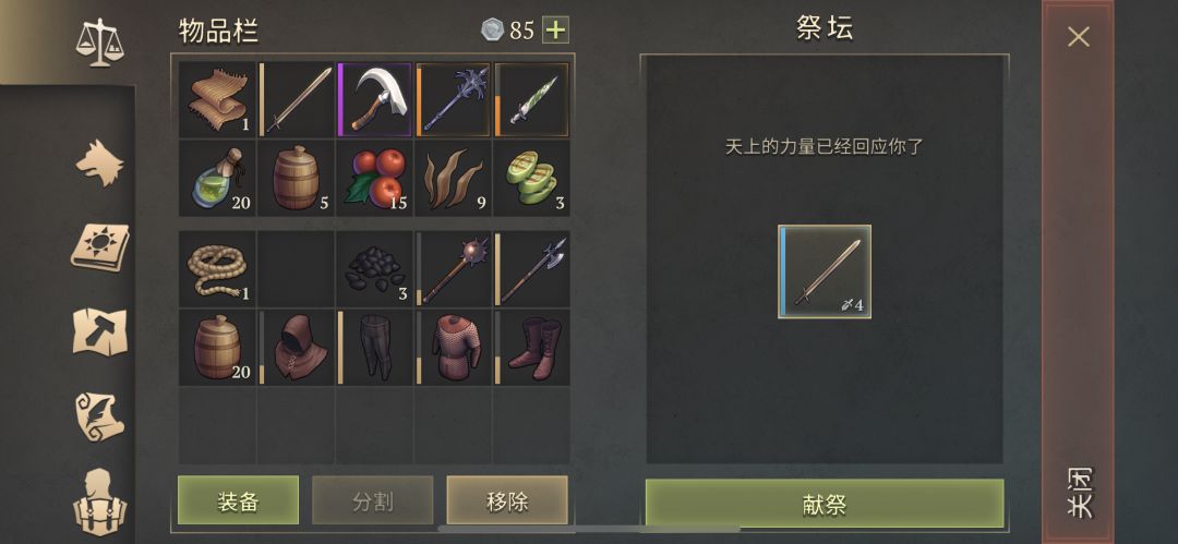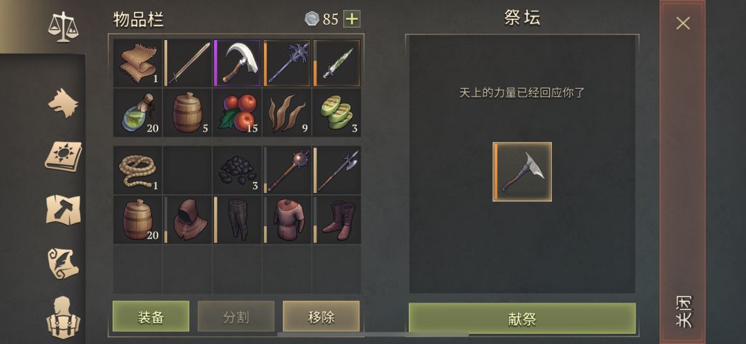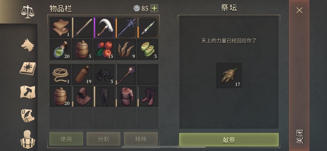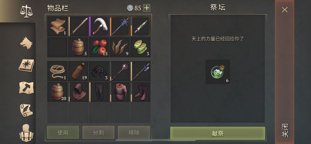 今日祭献差不多每种10次,前三20蘑菇药水,中间2张满耐久戟,后面是19个武器油。坐等三级包