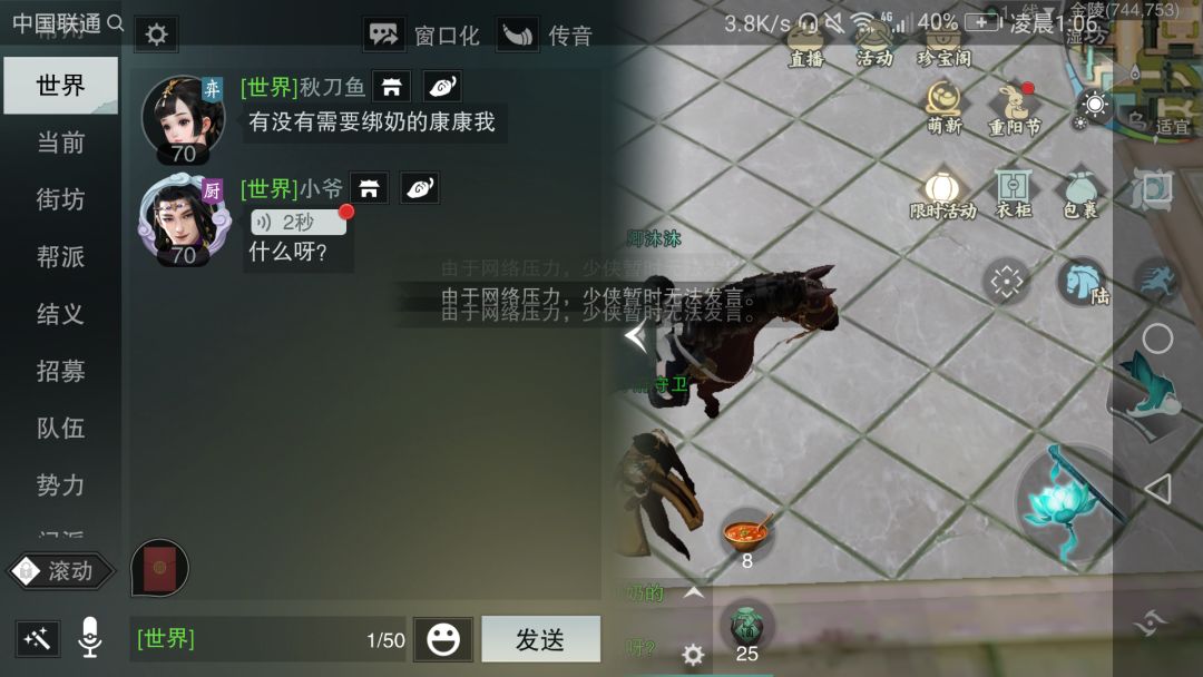 玩了半天,在世界上完全发不了言,说是什么网络压力,我Wifi和流量都试了一遍。。。。游戏体验贼差