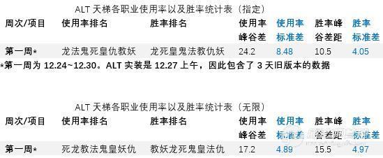 使用率双差上升、胜率双差下降。新版本由于可行套路增多,玩家乐于尝试,所以一般来说双差会下降,而使用率差距提升的原因则是因为强势职业相比上个版本变化不大。