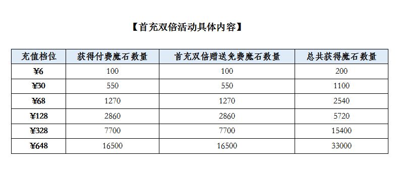 每个充值档位(仅限一次性获得付费魔石的商品项)的第一次充值均可享受魔石数量翻倍的福利!