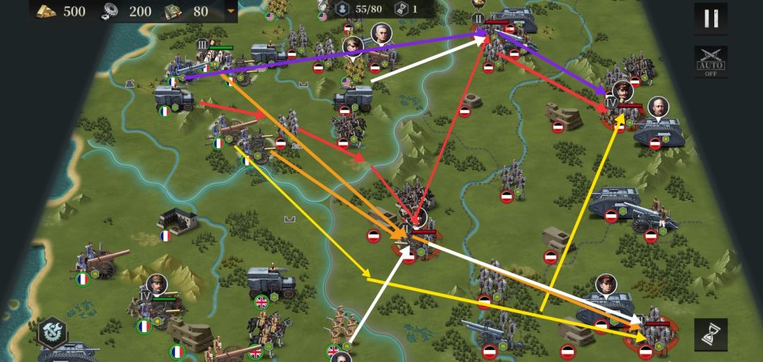 紫线是轻炮路线,注意保持人口别超和保证血量,用于攻坚。