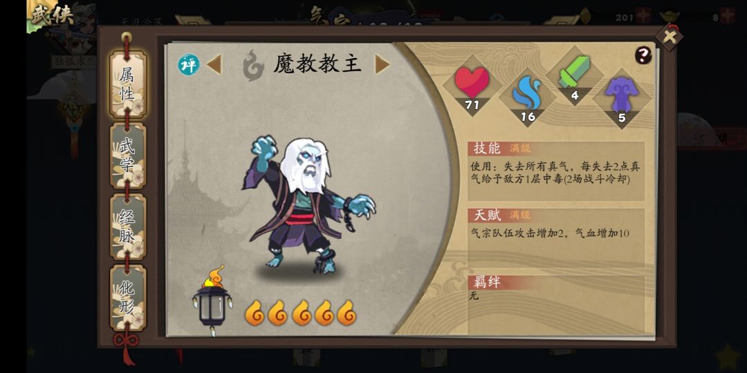 先说星宿。首先这是个紫,很容易凑出来橙化形羁绊,效果是对全体的叠毒,这是历练中梦寐以求的事。但注意根据描述,不管一次性对某个敌人叠了多少毒,对其他的全体都只叠1层。不是很强,但也有一定作用。(极度想念紫儿的橙化!气宗要是也有转移中毒层数,毒爆完胜气爆)但这不算完,请看少主。