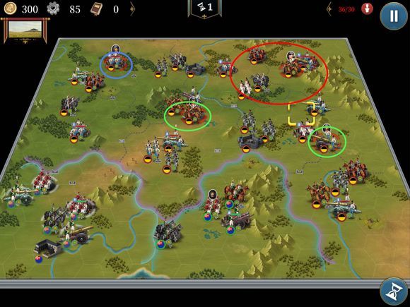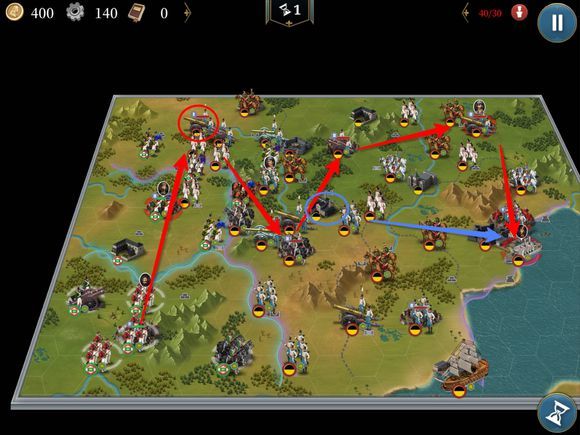 如图线路,在打下第一个红圈后,可以分兵推下面两个城,主力在红圈附近清兵并消灭俾斯麦。然后一起打毛奇。最后推上方红圈就可以了。