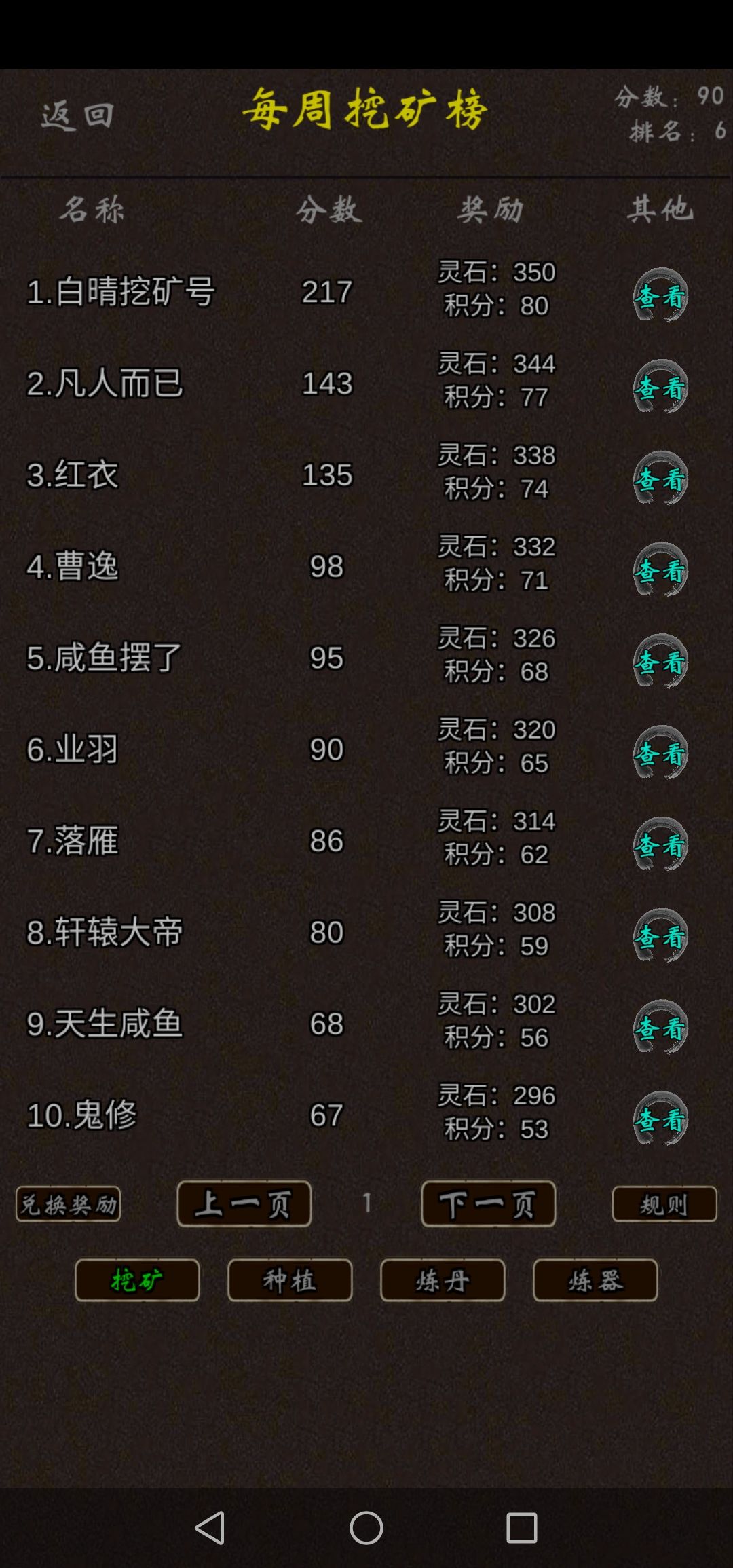 炼丹炼器挖矿种植都会增加分数,排行榜每周结算一次,奖励还算可观,比较重要的是其中的积分商城,在左下角兑换奖励处打开