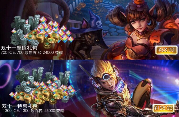 四款礼包促销持续7天,每款限购一次。68元或128元的超值礼包:欧泊石*700、ICE*700、荣耀币*24000。