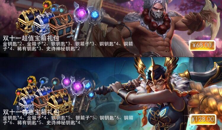 或者选择另一组合,68元宝箱礼包金钥匙、金箱子打包2个,银钥匙、银箱子打包3个,铜钥匙、铜箱子打包4个,稀有神秘钥匙*3,史诗神秘钥匙*2;¥128:以上翻倍!