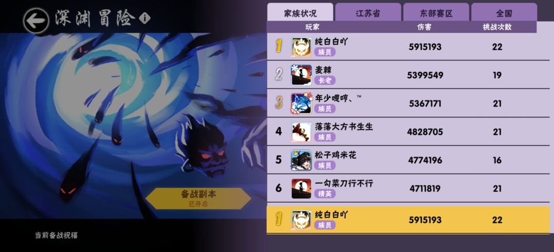 首先最重要的是族员的参战人数,第二是ss+和高级boss学会,还有每周卡牌一定要拉满,在深渊开始之前管理买好次数与卡牌,深渊卡牌可以提前带风刃,雷盾,纸人,救援卷轴这种主动技能类,不使用不会掉,带这些是以防意外翻车的时候放,整组保住一个次数在后面的boss能高个几百万的伤害,细节对家族拿更高深渊输出很关键(影响排名与层数)