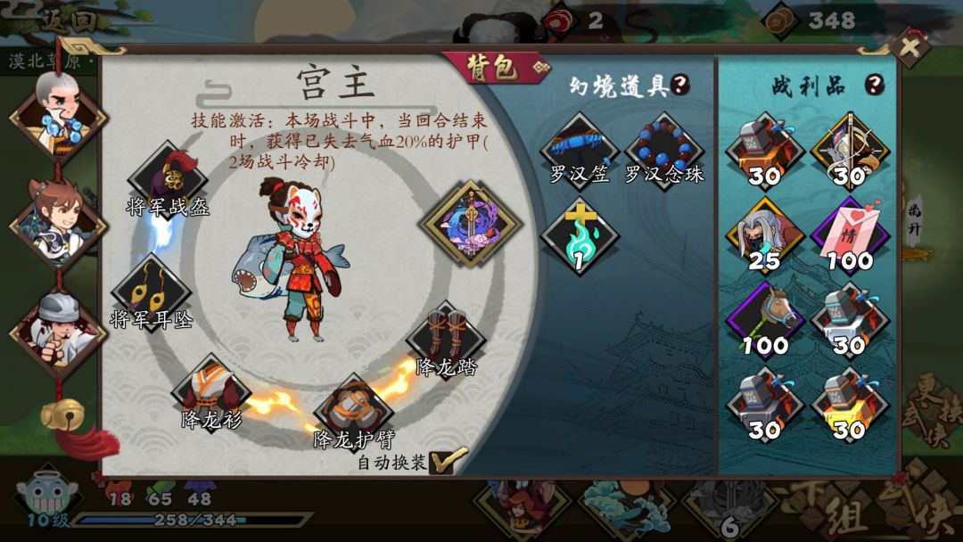 装备四象+清虚+将军+降龙+百战,前期优先降龙,罗汉套前期可以拿着度过
