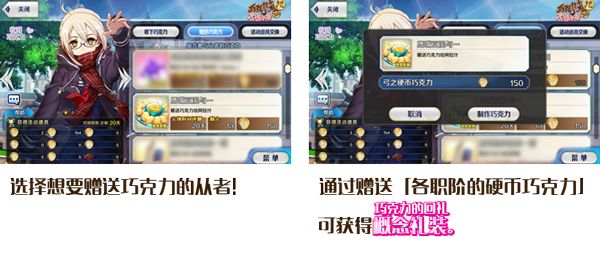 通过装备活动限定概念礼装「★5(SSR) 甜蜜水晶」「★5(SSR)熔岩巧克力蛋糕」可提升全职阶的硬币巧克力的掉落获得数量。