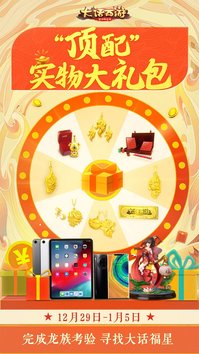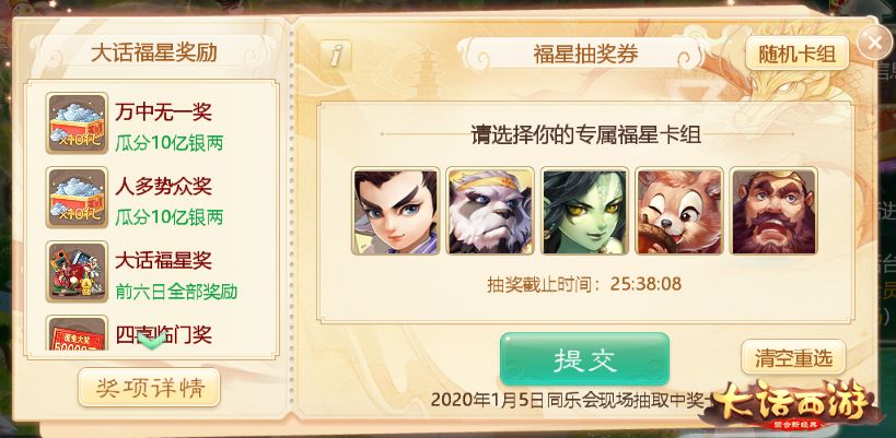 在2020年1月3日-1月5日中午12:00,符合最终抽奖条件的玩家就可以填写抽奖卡组,在1月5日晚的大话暖春同乐会活动现场参与福星卡组的抽取!届时将通过抽奖送出“大话福星奖”超级大礼包,奖品包括2019年12月29日-2020年1月3日所有的龙族福星大奖,奖品除了各种大话珍稀手办,还有黄金金条、iPad Pro、手机等,豪华程度旷古绝今,震撼好运横扫三界!