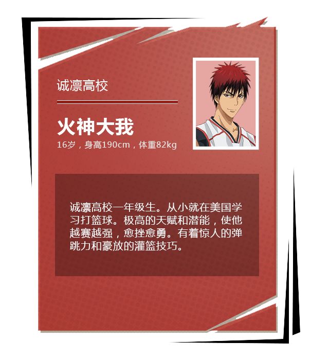在诚凛,火神遇见了黑子,并和他一起踏上了战胜 “奇迹的世代” 、成为日本第一的道路。背负着所有人的梦想,火神正不断努力,使自己变得更强。