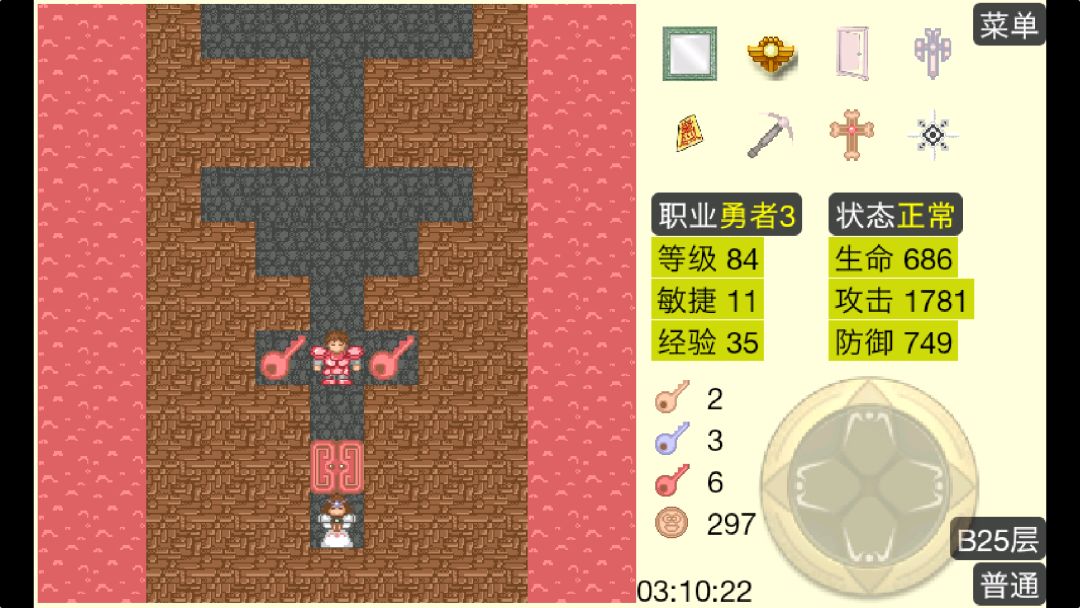 普通模式,按照传统(50层)套路,钱大多数点攻击,实在撑不下去买两回血和防御,经验全点升级。一路很顺。打到B15左右突然发现打不过了,然后,哦,20级的时候500可以买增幅器....这个时候已经40级了,买了之后又是一路推过去...没看过广告积分怪物钱和经验的比率是10:1,感觉数值有点失调了...敏捷值(暴击,miss)的引入应该是想给游戏一些变化,但也没什么太大的变化,玩家能拿到的敏捷很少,打0敏低敏没太大区别,打高敏(水银人)需要反复存读档,相当恶心。白银史莱姆还不错的,但15次有点无聊了...单就魔塔这个游戏模式来说,要么去掉敏捷值这个设定,强化地图设计; 要么让这个设计表现更丰富,会比现在这样子更好些