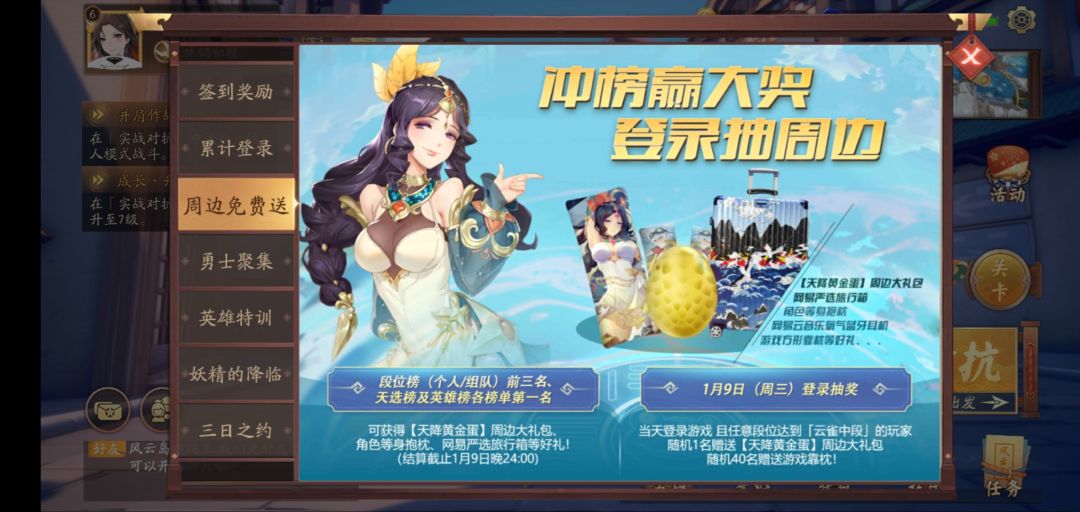 ⑥欧皇体质看这里1月9日任意段位达到『云雀中段』的玩家登录游戏抽奖,抽取欧皇小哥哥【or小姐姐】一名,赠送【天选黄金蛋】周边大礼包『内含至少6件周边礼物哟』随机抽取40名达到段位要求的玩家赠送游戏靠枕一只云雀中段很容易达到的,一天一局,七天也能达到的呢