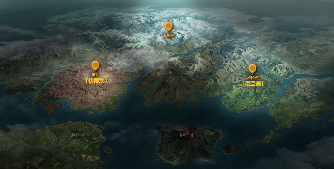 上面是官方最近提供的崇拜火之力的「伏尔坎」与信仰水之力的「尼亚德」两国势力介绍视频。地图中两个国家的位置是如下,从中大家可以发现《TRAHA》的世界特别广阔的,且地形多样。
