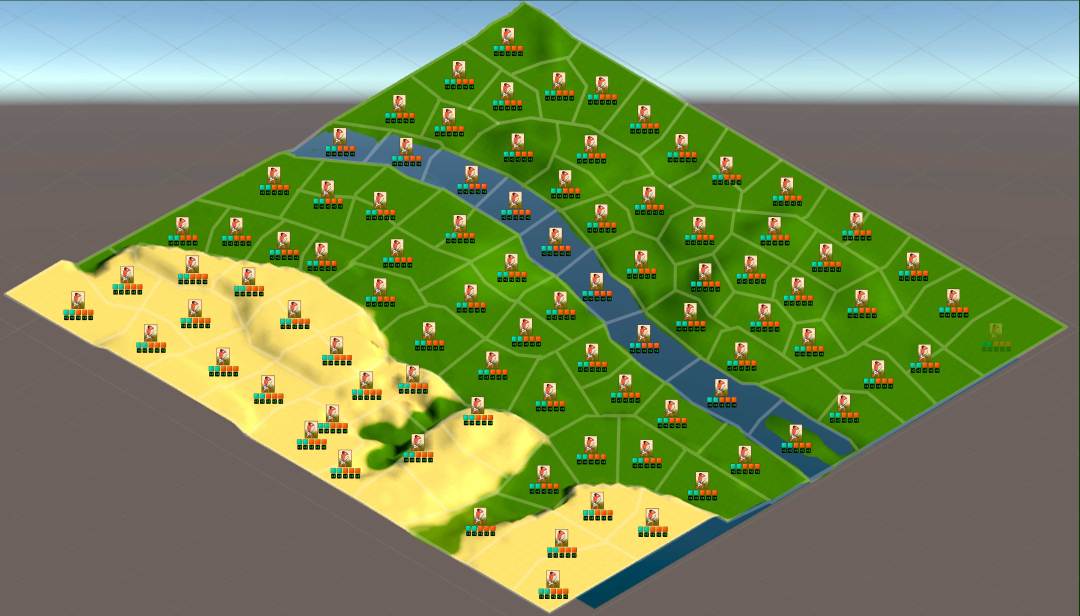 地图创建过程的主要目标,是尽可能地将孟菲斯城和尼罗河地块的自然风光还原历史原貌。最初我们计划采用2D图形来制作,与前作《史前埃及》(PredynasticEgypt)一样。之所以要这样做,主要原因是因为我们的艺术家们都缺乏3D图形相关的经验。在结束《史前埃及》(PredynasticEgypt)的工作之后,他们开始制作《埃及古国》(Egypt Old Kingdom)的地图,最初的项目看起来就像是这样: