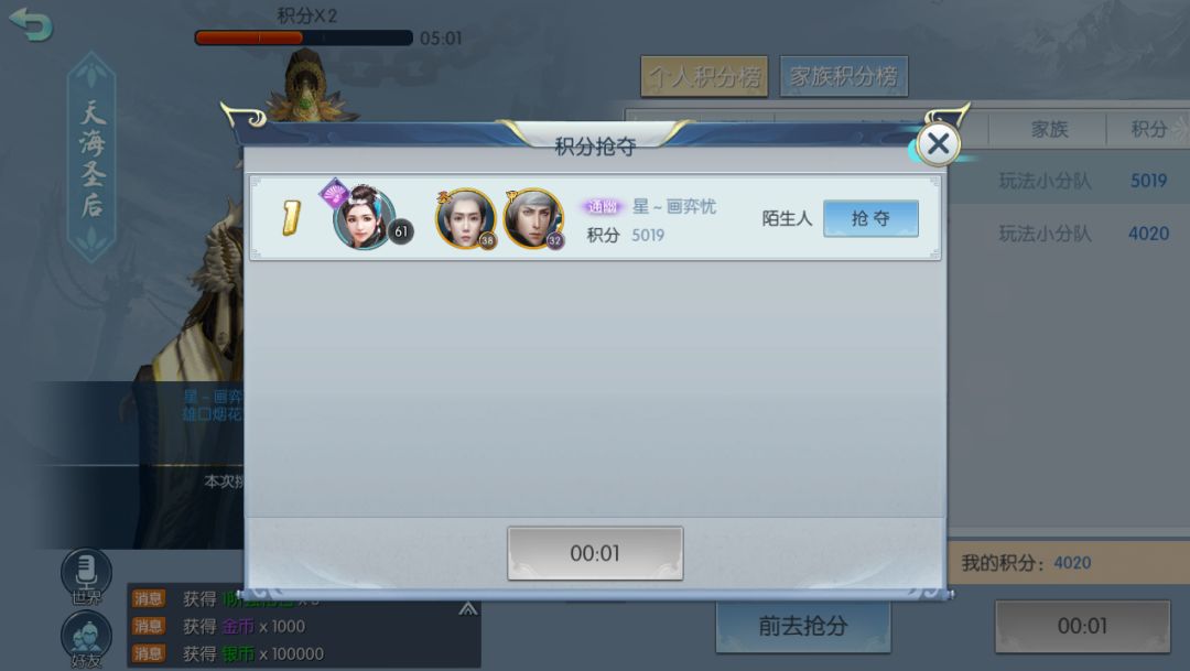 在获得积分后,我们可以领取积分奖励。当然也可以通过抢夺其他玩家的积分来获得积分,好友和同家族成员的积分是不可以抢夺的哦~