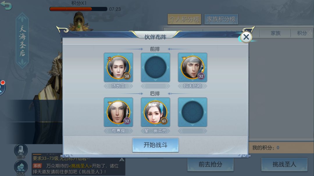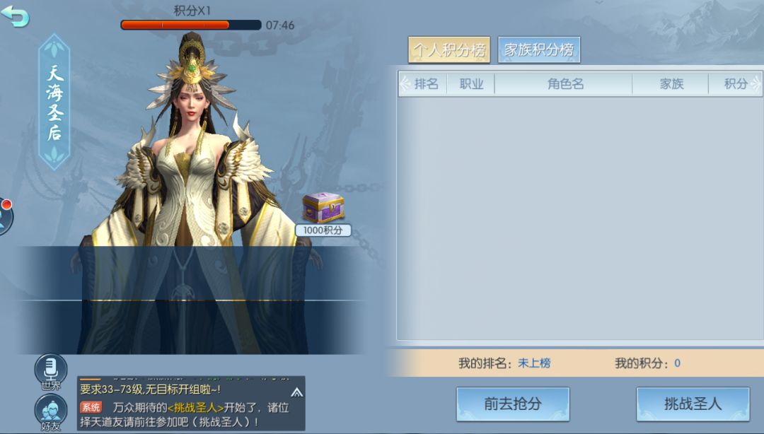 活动开始时,我们会收到系统消息提醒,点击参与即可进入活动页面,我们可以选择挑战圣人获得积分,也可以选择抢分来抢夺其他玩家的积分。
