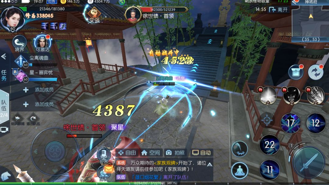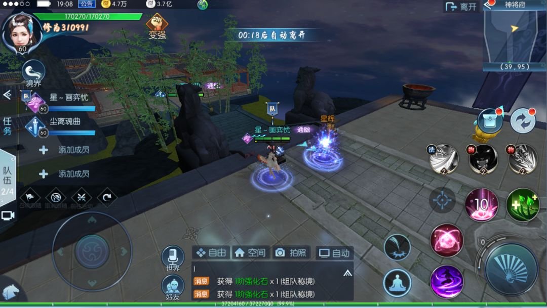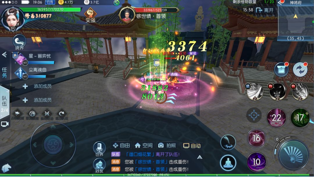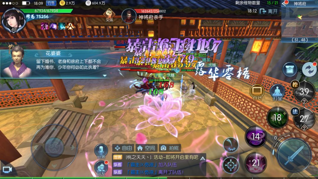 推荐伙伴出战落落和七间,手动操作控制绝技释放顺序。落落绝技钟山风雨剑能极大的提高角色暴击几率,配合七间的高爆发绝技,充分享受满屏暴击快速清怪的快感吧。如果各位道友有甲级伙伴甚至圣迹伙伴,输出会更高。