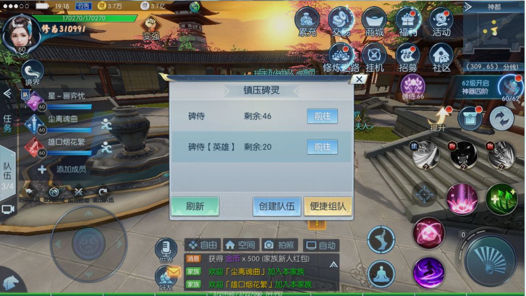 活动开放期间,游戏主界面将会出现碑灵的实时数量显示,点击这个按钮,我们可以看到不同难度的碑灵数量和快捷组队的选项。