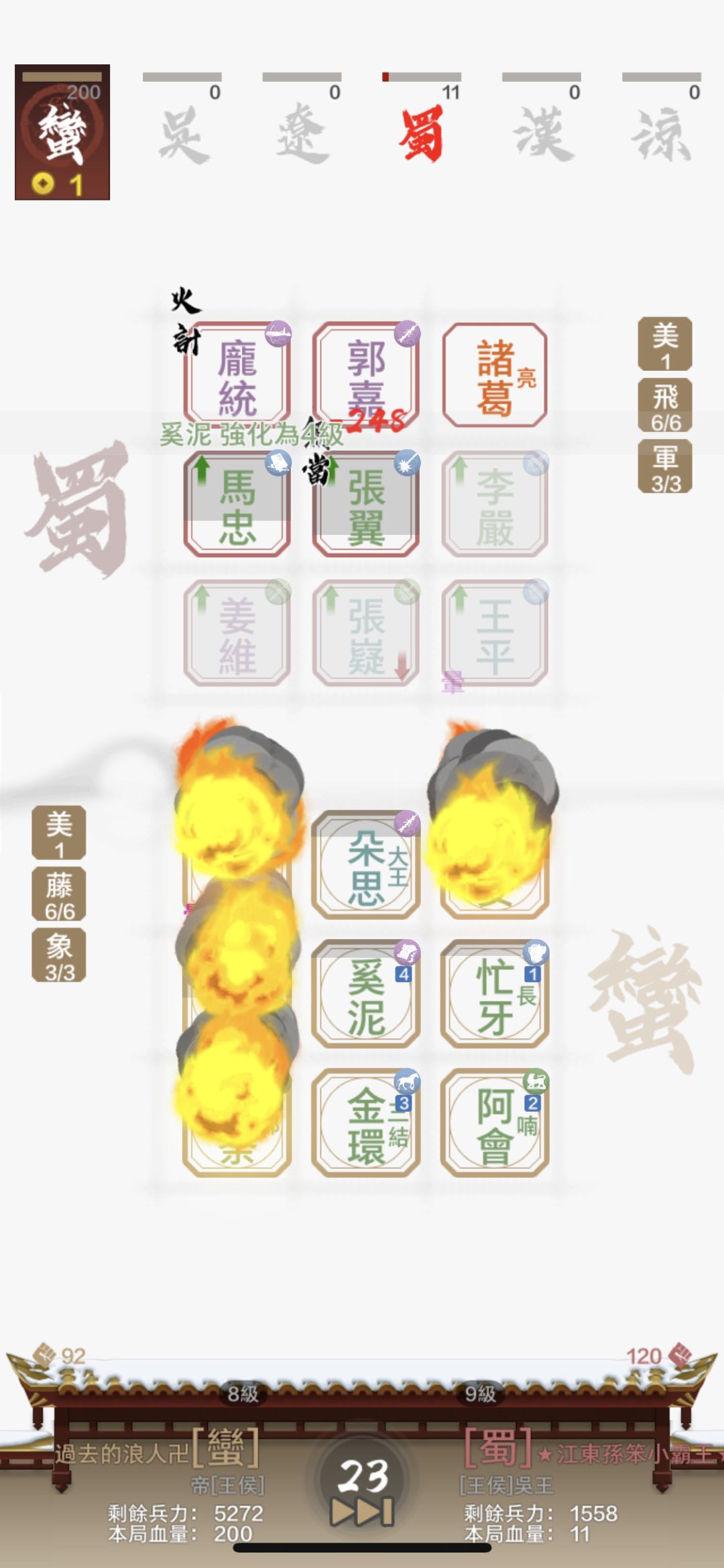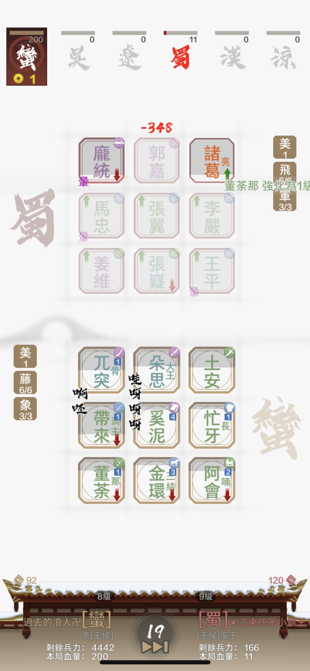 不得不題外話稱讚字走三國的文字和配音,一開始玩蠻族就很驚艷象兵的大象聲,也讓我對這些小時候玩三國群英傳不太有興趣的蠻族將領有新的認識。白馬的閃避、黃巾的潰敗、禁衛的臉紅脖子粗⋯等,也都讓我為之一亮,所以總是開著音效聽好聽滿。再次謝謝字走團隊給我很好的遊戲體驗,期待之後版本的更新!