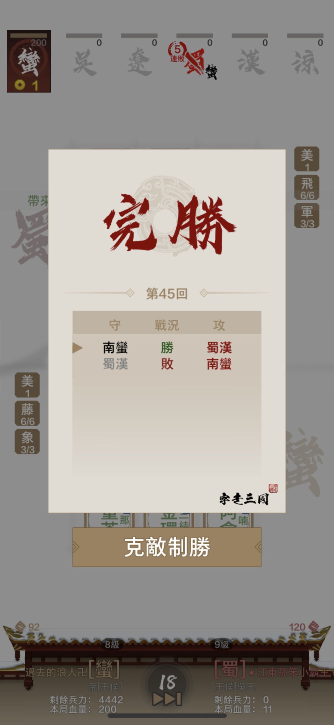 今天為了解每日任務的藤甲兵種,第一次玩藤甲兵。可能是三國殺對藤甲的印象就是被火攻火計輾壓,玩煉獄感覺電腦就會遇到六軍師燒爆,所以一直不想嘗試,今天試起來意外的順暢,中間有三回合不小心輸掉有sl ,最後結果45回合滿血連勝(順便解了滿血連勝的任務),來推廣一下。