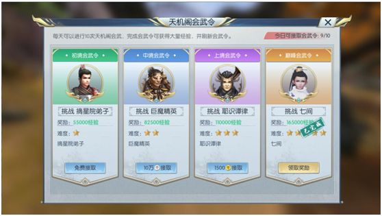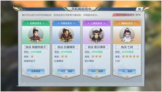 天机阁会武每天可以领取十次,完成后将获得大量经验奖励。而挑战难度也并不高,小编认为,是我们每天必做的任务之一。