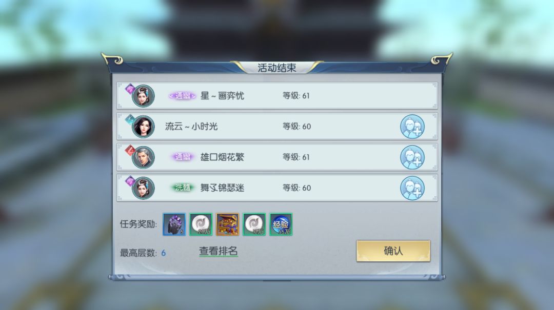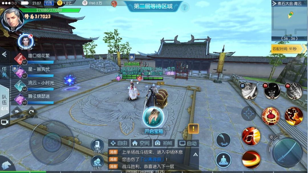 在完成一轮战斗后,我们将回到准备场继续等待下一轮匹配。此时,场景内将刷新神秘宝箱,开启后可以获得各种道具奖励,到达最高层的玩家还将获得紫色称号“惊破天石阵”奖励!