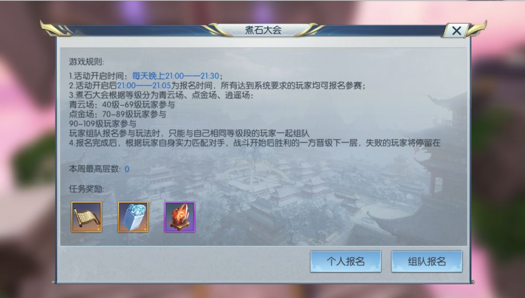 与天机老人对话可选择报名和查看历史排行榜,进入报名界面后,我们可以选择单人报名和组队报名,组队报名需要4人组队且只能队长进行报名操作。当然,小编还是建议道友们提前组好自己理想的队伍配置,避免单人报名后由系统匹配到队伍职业搭配不理想。