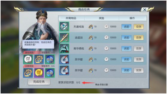 在交货3样道具后我们也可以向帮会其他玩家求助,由帮会成员来帮我们完成任务,帮助提交道具的玩家将获得帮贡奖励。