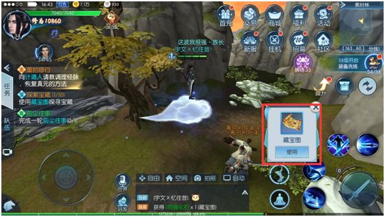在完成这个藏宝图的挖掘后,系统会自动弹出下一张藏宝图的使用选项,点击就可以自动寻路到坐标并挖掘。
