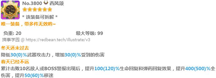 西风颂武器:携带武器吃武器攻击力,西风颂加成只有250%。不吃武器攻击力的有海德拉,毒歌(毒歌大部分伤害是靠毒爆),樱泪,瓶中天等。