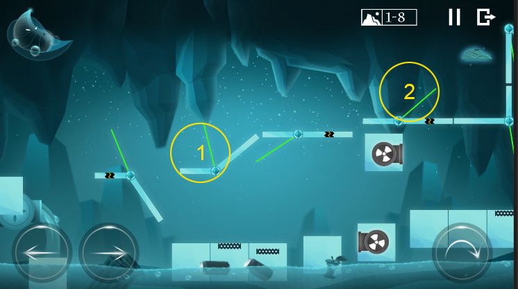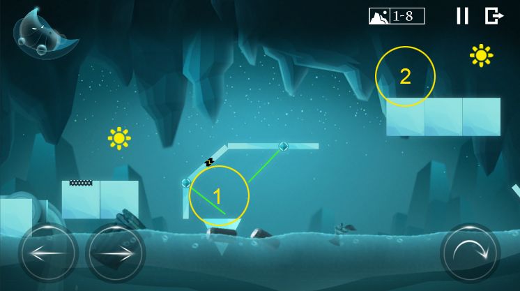 这里,水珠人需到位置1的三角形吸附大气泡,然后才能跳到位置2。这过程需要注意位置1的秒针运行状态,如上图的位置,水珠人跳到三角形是安全的,但如果秒针是运行在左边,水珠人还在三角形上,会很容易被秒针往左边推下水