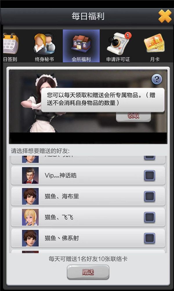 大亨5的玩家每天在会所福利内免费领取20猎聘券,并可以选择任意一名好友赠送10张猎聘券/天。介于该途径属于极小众群体的福利,Chen在这里就不再细说了,对于平民玩家,我们需要的是玩好自己的号,开心的去享受游戏给我们带来的快乐。