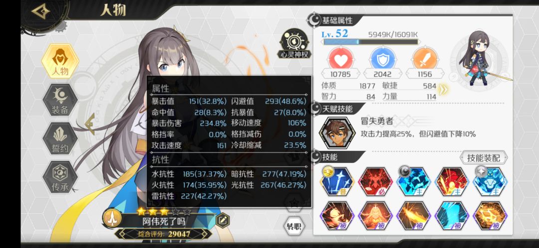 贴上自己的图,次元魔女52级,装备很差,神代下星期才5星,目前没有神代天赋从62爬到了73,缓一缓等明天再继续推。(之前是元素弓,48级打到神代那层推不动了)