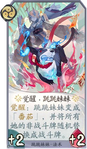 但其实这是一个很大的误解,跳跳妹妹的核心玩法是前期利用召唤法术二哈(番茄)来进行攻击以及战场到3勾后觉醒变成番茄(备注:在不加任何buff情况下默认为6/7的大屁股身材)并把跳妹全部法术变成(极其超模的)攻击牌,在此时跳妹的战斗牌和攻击是变回只需要一点鬼火