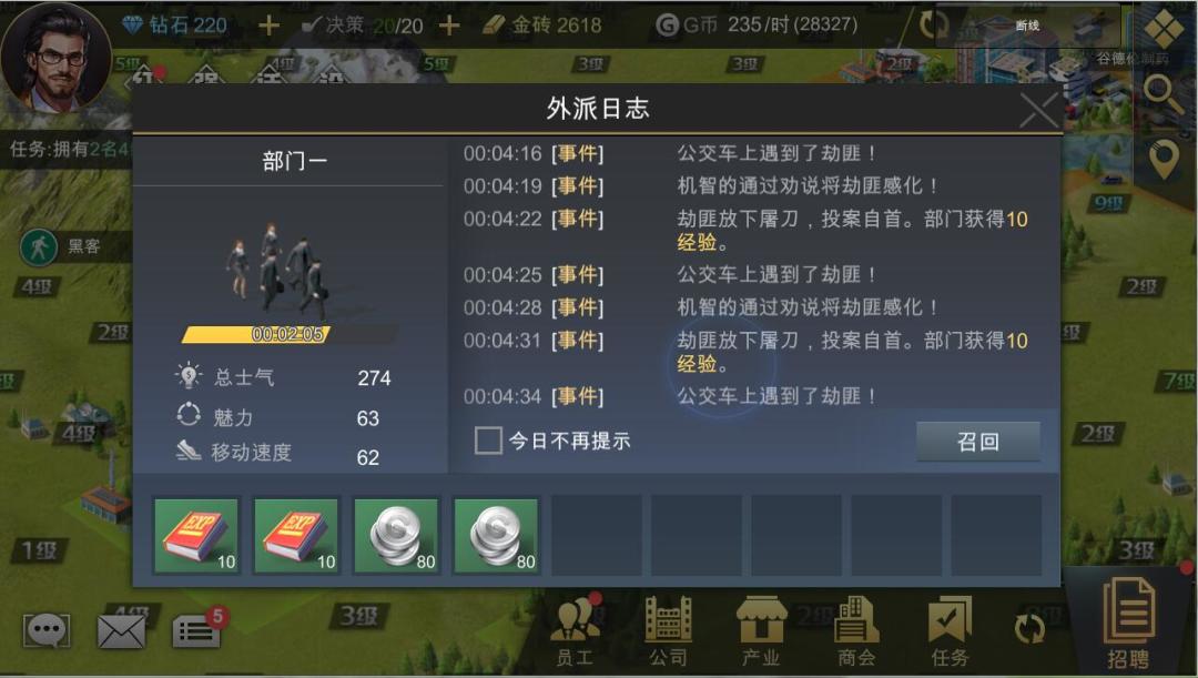 玩法,让玩家在推图占地的同时,还可以体验随机事件的乐趣。在游戏中,每当玩家进行员工外派相关操作(包括收购、调研、促销等)时,就会触发