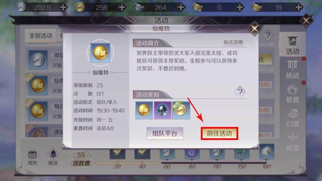 仙魔劫会在每周一和周五的19:30-19:40期间开放,修真者需要达到23级才能参与。在这个活动中,修真者不仅可以获得大量经验和灵性水晶,还有一定几率获得金币奖励。