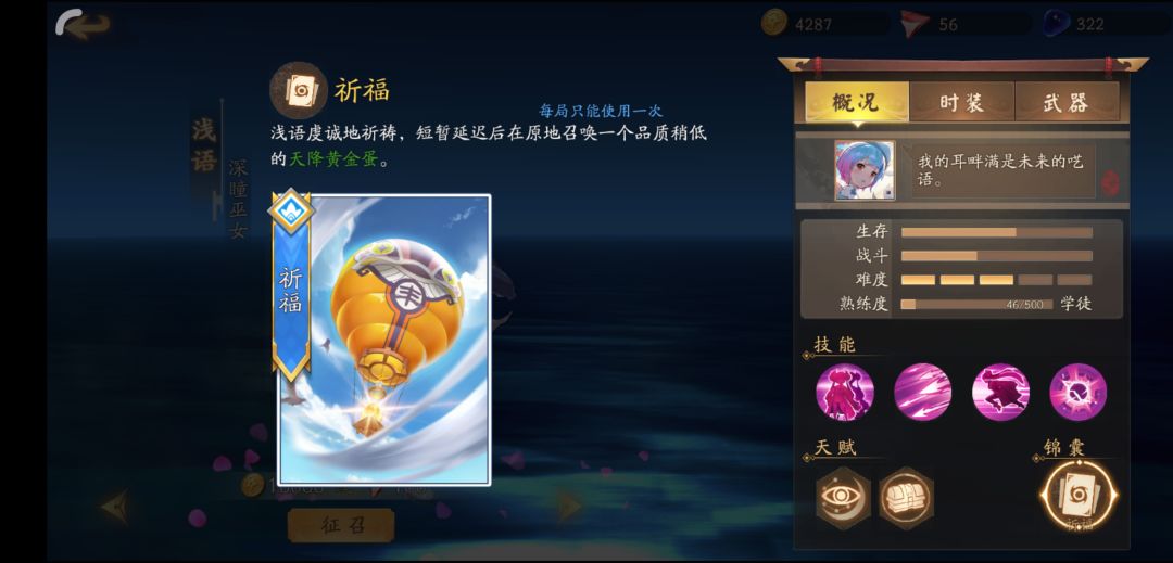 下面是浅语的锦囊技,召唤一个黄金蛋,但是这个黄金蛋不一定出紫,还是看欧气,总之玩浅语要欧气的。浅语的锦囊基本上是落地以后发现周围没人就用,用的越早肯定越好。另外手速也很重要,别被队友抢了。