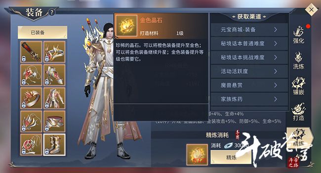 当斗者们到达 70级,会随之开放精炼页签,在这里斗者们可以消耗金色晶石,将橙色装备精炼为金装,其中精炼武器和衣服分别需要消耗132颗晶石,其余部位需要消耗的晶石数量为120颗。金色晶石的获取渠道比较多,除了元宝商城之外、参与秘境话本、魔兽悬赏、家族炼药、领取活动活跃度均可获得不同数量的金色晶石,同时目前的全区跨服家族赛中也有金色晶石奖励。