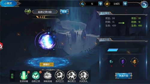 《圣痕觉醒》小精灵可以增加攻击、生命、防御3种属性,还可以获得6个技能,一开始玩只可以使用两个技能,其他的技能需要玩家提升小精灵的等级,完成升阶以后才能解锁。