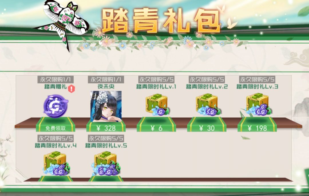 5)踏青礼包:活动期间,踏青礼包上架:时装-夜未央、钻石、青团、游戏币、琉衣亲密度等等;