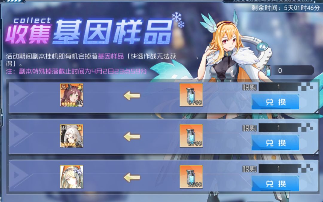 3)基因样品收集:活动期间,基因样品可兑换工程专属装备、5星春田神农、5星苏仙、时装-初次摄影(非常阔爱)等等;基因样品可在副本挂机中掉落(快速作战除外);登录赠送基因样品;