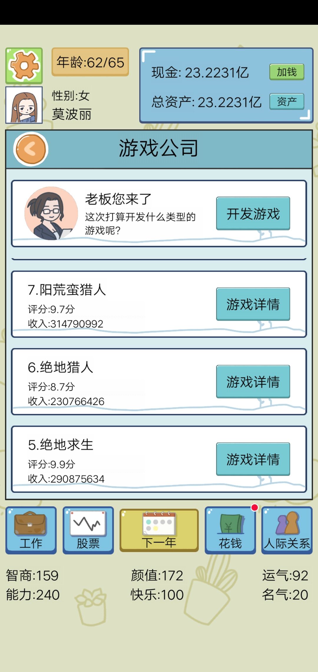 开局乱点 大学都不用上 找几个刷钱的人5W到30W的 然后看广告解锁3个投资 努力攒到2500W投资游戏公司 然后开发游戏(主机 射击 猎人 推广方式看自己钱的多少选择)然后3年一个周期 一次多研发几个游戏3年最少2个亿 然后循环刷钱刷到退休