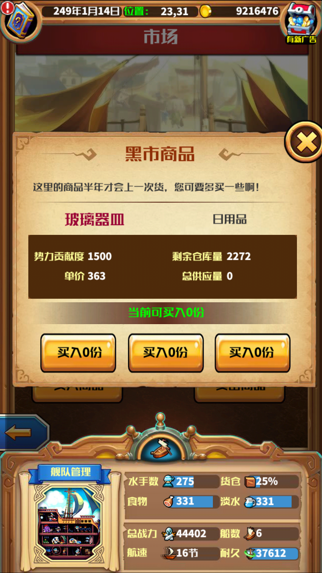 接下来开到同海域的B港,卖出A港买的压仓物,开始买入炒货的物品。这里由于玻璃是日用品,所以购买的商品也就是日用品,这些是每个港口都有的,如铁罐什么的。。。每次买最少的量,把货价搞到150%,再卖出特产。关于炒货的部分,如果还有什么不明白,可以去看我的上一个帖子。