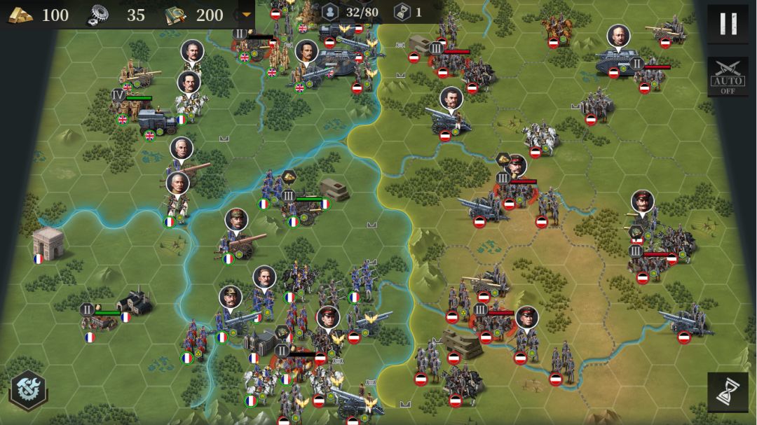 开局先上将,主力炮兵率大部向右,准备接管友军即将丢掉的二级城。剩下的往上,准备接管英国受不住的二级城。接下来会与敌军相持住,用占下的城来多造点军事策略卡,会有大大的用处。