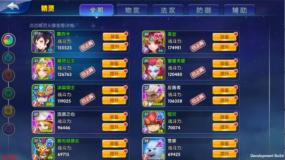 精灵养成界面可以进行精灵升级、升星、符文晋升、提高技能和重生操作。